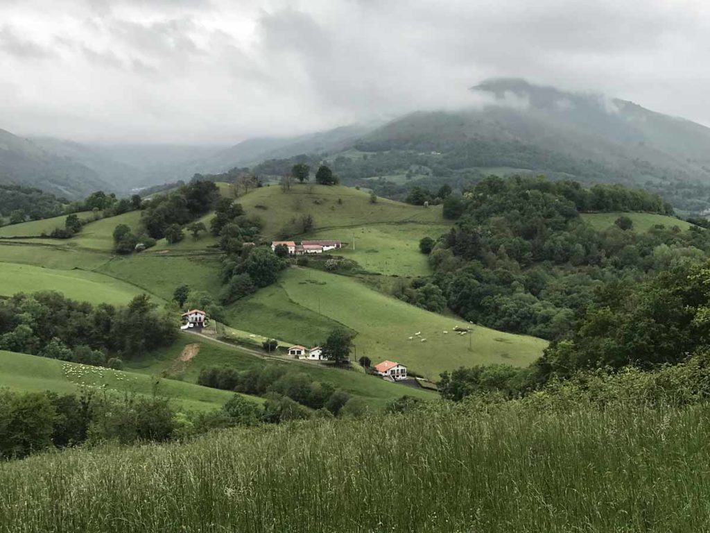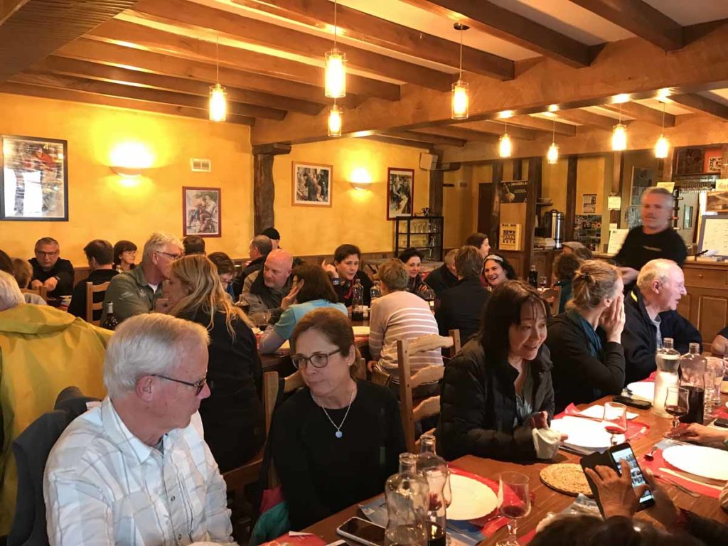 The lush scenery was beautiful, but the overcast weather began to get misty with sprinkles shortly before arriving in Orisson at around 11am. I was really glad to be stopping for the night, but felt sorry for the many pilgrims continuing up & over the Pyrenees in the misty, wet weather. We guests at Refuge Orisson enjoyed a relaxing afternoon in their cozy café & a lovely communal dinner that evening (above) where we met more of our fellow pilgrims.