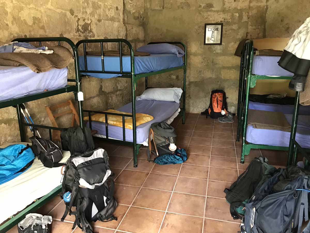 Ah, yes, the famed “pilgrim hostels” (albergues), which are dotted all along the Camino to house us weary pilgrims. Albergues can vary greatly, but they all offer coed dorm rooms with bunk beds – sleeping anywhere from 4 to 40+ people in a room. The bunks come with a mattress and pillow, but pilgrims need to bring their own sleeping bag (or sleep sack). The bathrooms are usually gender-divided (but not always!) and the showers provide hot water!