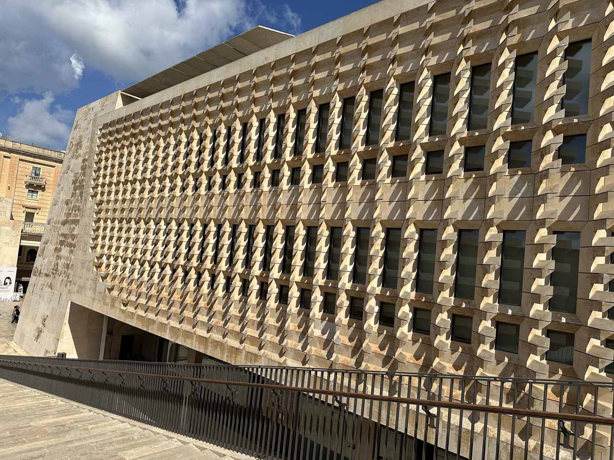 First Stop is the sleek City Gate, the main entrance to Valletta. Newly designed in 2013, its footbridge crosses an 18-meter (59-foot) deep dry moat and passes through the city’s old ramparts. It’s flanked by Malta’s also new Parliament Building (built in 2015). (photo below right)