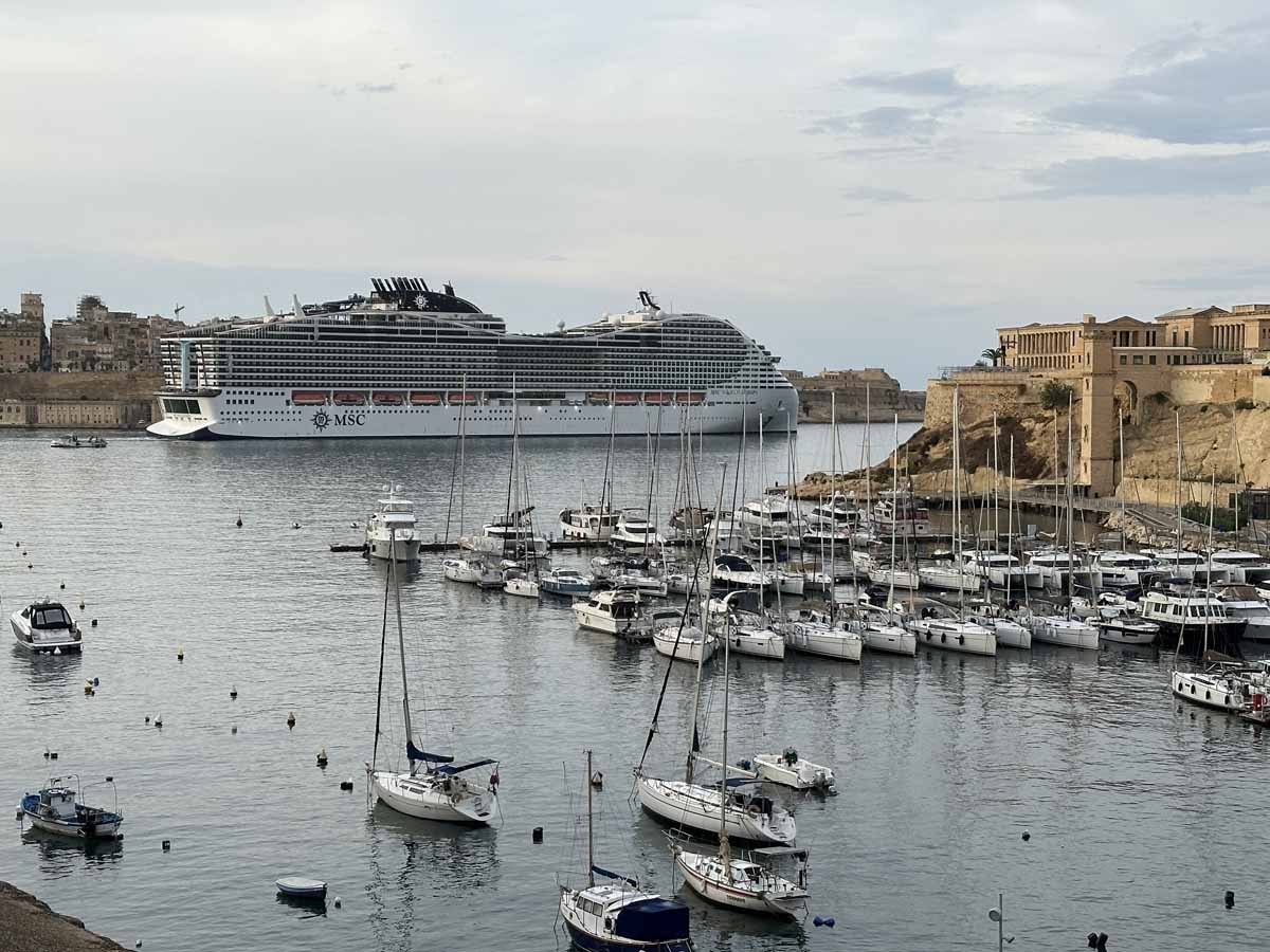 Along the way, we got a view of a HUGE cruise ship (photo above) that was heading out of the Grand Harbour after its Valletta port stop that day. This MSC “World Europa,” which is one of the world’s largest, holds around 5200 passengers. It seemed to dwarf the town!