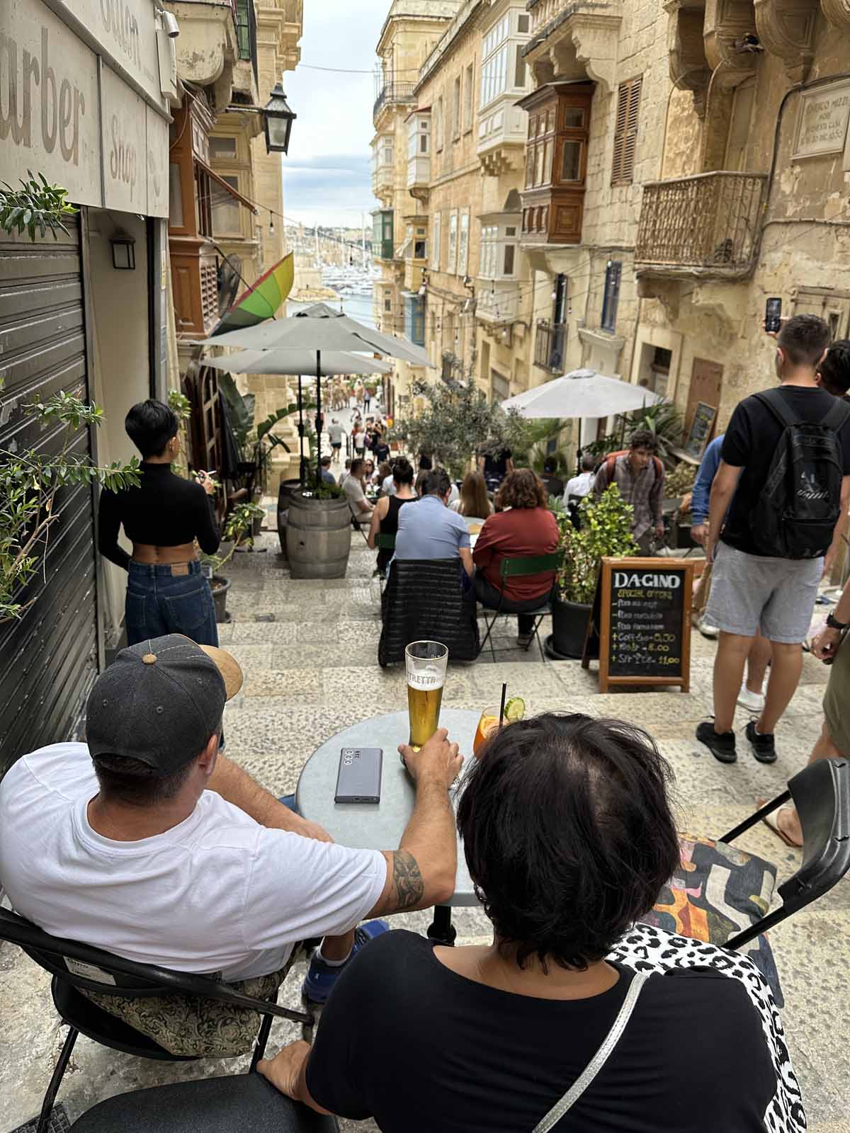 Plus, Valletta’s city center is filled with nightlife – from its many cafes, restaurants and bars. And much of it was outdoors (since we were there in mid-October with still warm weather). In wonderful Maltese style, sidewalk tables, chairs and cushions were laid out along each level of the many steps leading up some of the side streets – and they were filled with people of all ages enjoying Maltese life!